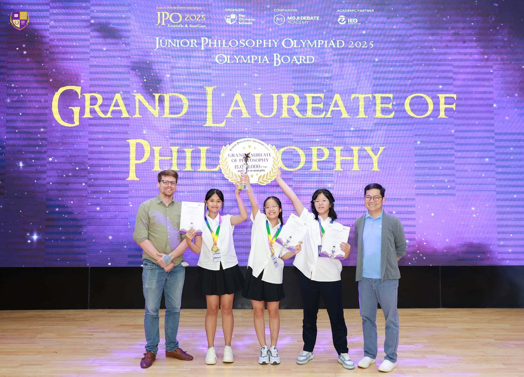 Tại vòng chung kết tổ chức ở Hà Nội, các đội đã mang đến những phần thể hiện ấn tượng từ bài viết triết học, bài kiểm tra kiến thức đến những màn đàm luận triết học đa chiều. Kết quả chung cuộc, Ban tổ chức Junior Philosophy Olympiad 2025 đã trao giải Nhất bảng Olympia cho đội Dynametises. Tại bảng Griffin, 3 học sinh đội 1 step forward, 3 steps back đến từ Hà Nội gồm: Trần Ngọc Minh, Hoàng Lily Bảo Anh và Nguyễn Thanh Tâm giành giải Nhất.