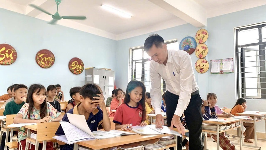 Khi tiếng trống trường vang lên, thầy lại động viên các em lên lớp, khích lệ những học trò còn e dè, sợ đường xa hay muốn bỏ học. Công việc của một ngày tưởng chừng giản đơn, nhưng với một giáo viên ở vùng đặc biệt khó khăn như xã Bố Trạch, mỗi việc đều chất chứa tình thương và trách nhiệm.