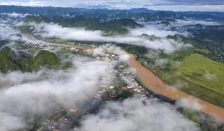 Dòng Sông Son như dải lụa hồng mềm mại, ẩn hiện trong mây uốn lượn qua điệp trùng núi non kỳ vĩ của Di sản Thiên nhiên thế giới Phong Nha-Kẻ Bàng.