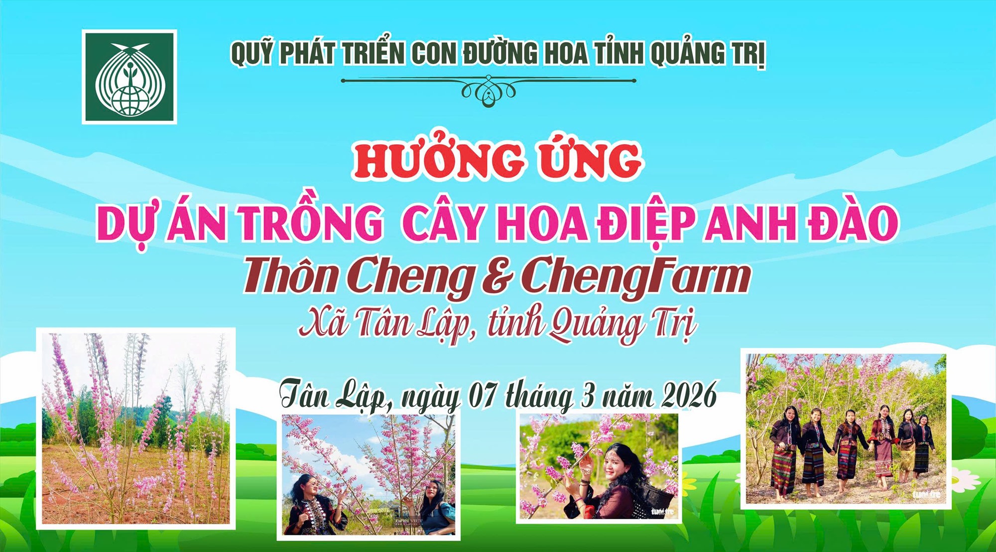 Hưởng ứng Dự án trồng cây Điệp anh đào do Quỹ Phát triển con đường hoa tỉnh Quảng Trị phát động, ngày 10/3/2026, Khu nghỉ dưỡng Cheng Farm (thôn Cheng, xã Tân Lập) đã tổ chức trồng nhiều con đường hoa Điệp anh đào tại khuôn viên của mình.