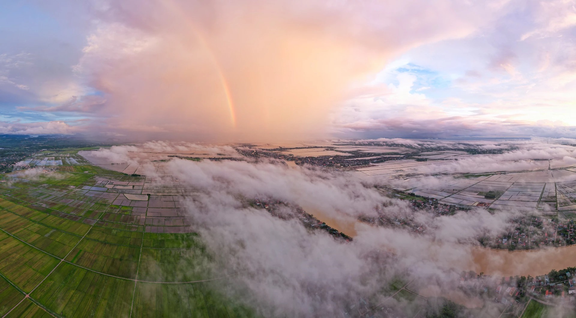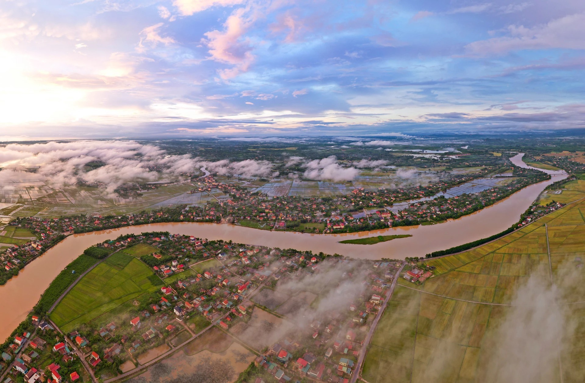 Từ trên cao nhìn xuống, dòng Kiến Giang sau lũ như một nét cọ uốn lượn giữa “xứ Lệ”. Những màn sương mây không che khuất được hình ảnh về một dòng sông vừa vượt qua thử thách của thiên tai. Sau mùa lũ, Kiến Giang như một bản tình ca không lời, lãng mạn và kiên trung. Sông cứ thong thả trôi, tựa như chưa hề trải qua mưa lũ, mở ra một chân trời mới ửng hồng sau màn sương.