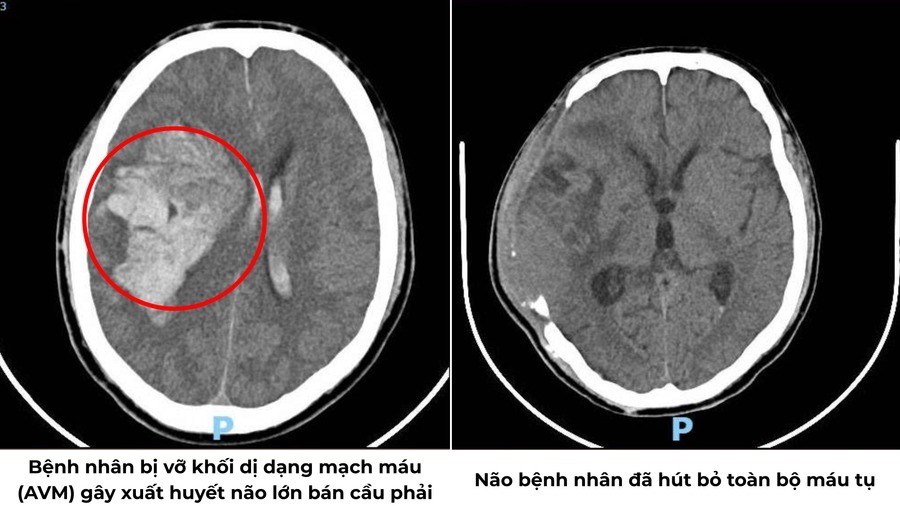 Tại Khoa Hồi sức Cấp cứu, bệnh nhân được khẩn trương hồi sức và thực hiện các xét nghiệm cấp cứu, chẩn đoán xuất huyết não nặng, khả năng do AVM (dị dạng mạch máu não) vỡ.