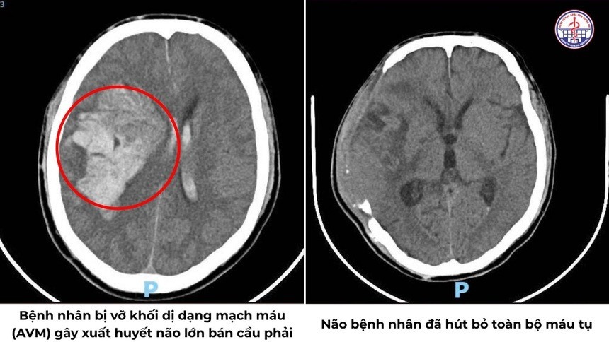 Kết quả chẩn đoán hình ảnh cho thấy tình trạng rất phức tạp: xuất huyết nội sọ lan tỏa nhiều vị trí, có dị dạng thông động - tĩnh mạch (AVM) nội sọ kích thước lớn khoảng 37 x 58 x 87 mm, đồng thời khối máu tụ gây chèn ép nhu mô não.