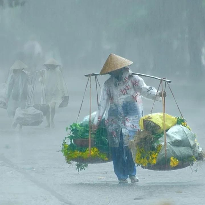 Sáng chạy ngang qua làng, trời mưa lâm thâm, mợ không mũ nón. Chỉ một mảnh ni lon choàng vai. Cánh tay ngắn củn vẩy, cho mợ qua huyện, chỗ chữ thập đỏ để nhận quà.