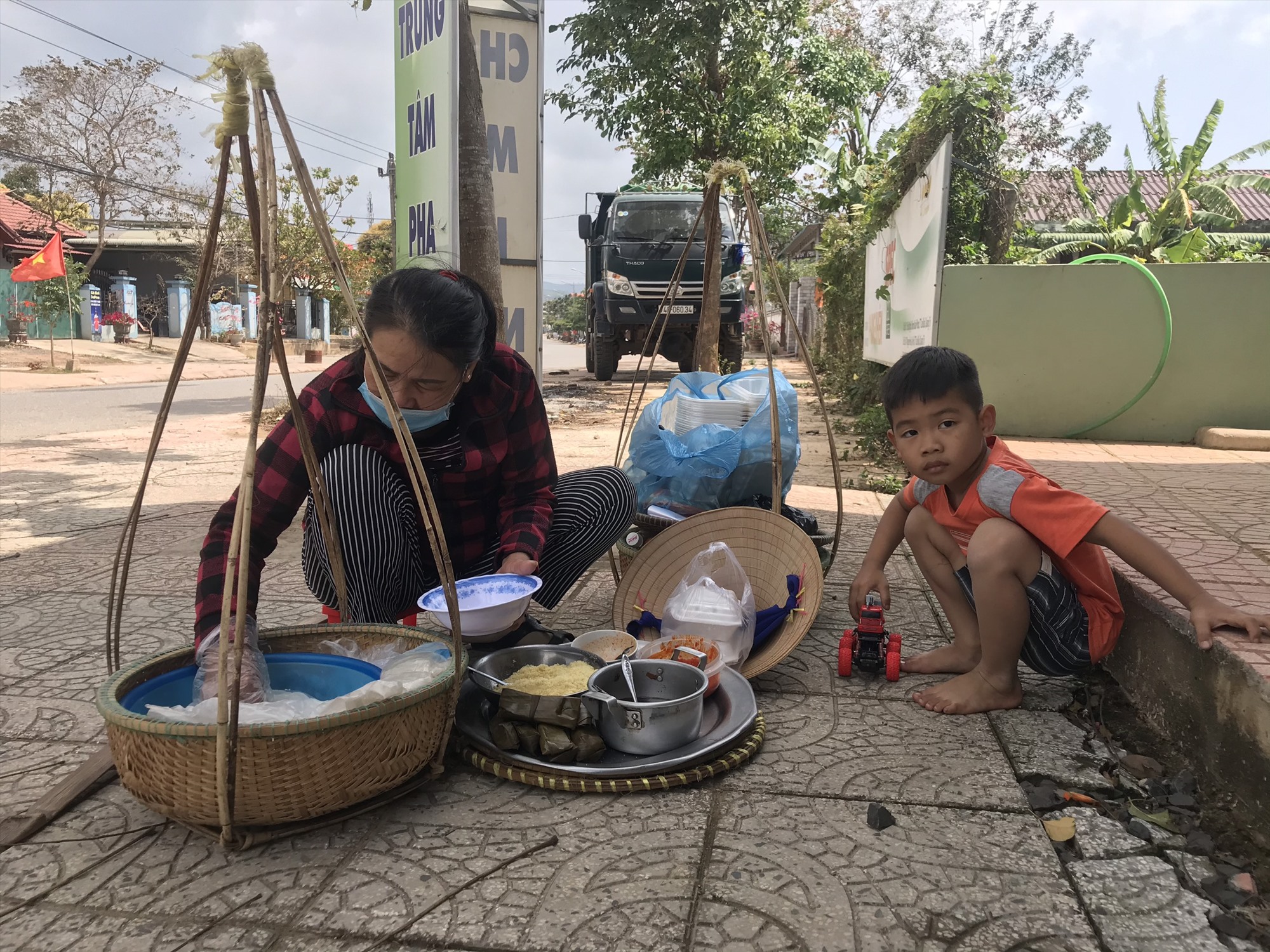 Đó là bà Lê Thị Dưỡng (SN 1966, trú tại thôn Long Giang, xã Tân Long, huyện Hướng Hoá, tỉnh Quảng Trị). Với đôi quang gánh cùng dáng người dẻo dai, bà mưu sinh trên chính quê hương này bằng nghề đi bán bánh dạo.