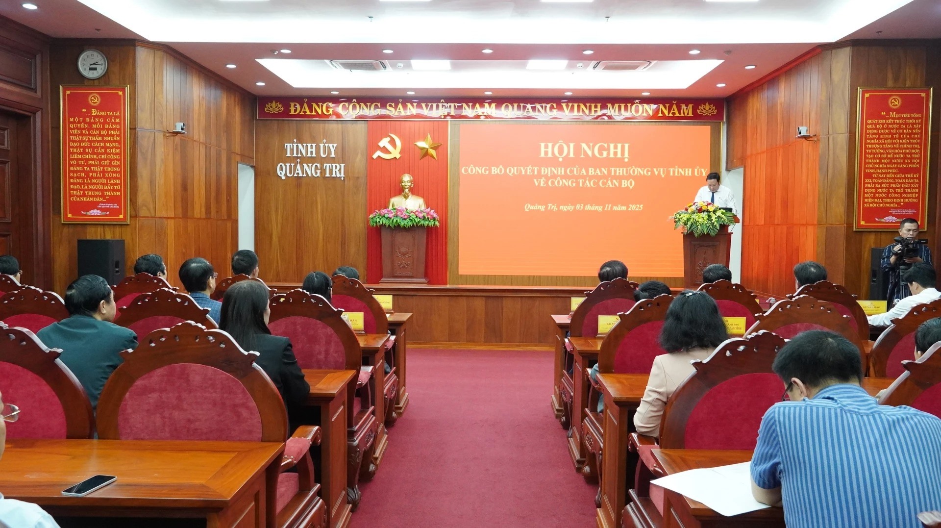 Chiều 3/11, Ban Thường vụ Tỉnh ủy tổ chức hội nghị công bố các quyết định về công tác cán bộ. Tham dự có các đồng chí: Nguyễn Văn Phương, Bí thư Tỉnh ủy; Trần Vũ Khiêm, Phó Bí thư Thường trực Tỉnh ủy; Nguyễn Đăng Quang, Phó Bí thư Tỉnh ủy, Chủ tịch HĐND tỉnh; Trần Phong, Phó Bí thư Tỉnh ủy, Chủ tịch UBND tỉnh; các đồng chí Ủy viên Ban Thường vụ Tỉnh ủy, lãnh đạo UBND tỉnh, Ban Thường trực Ủy ban MTTQ Việt Nam tỉnh; lãnh đạo Văn phòng UBND TP. Huế.