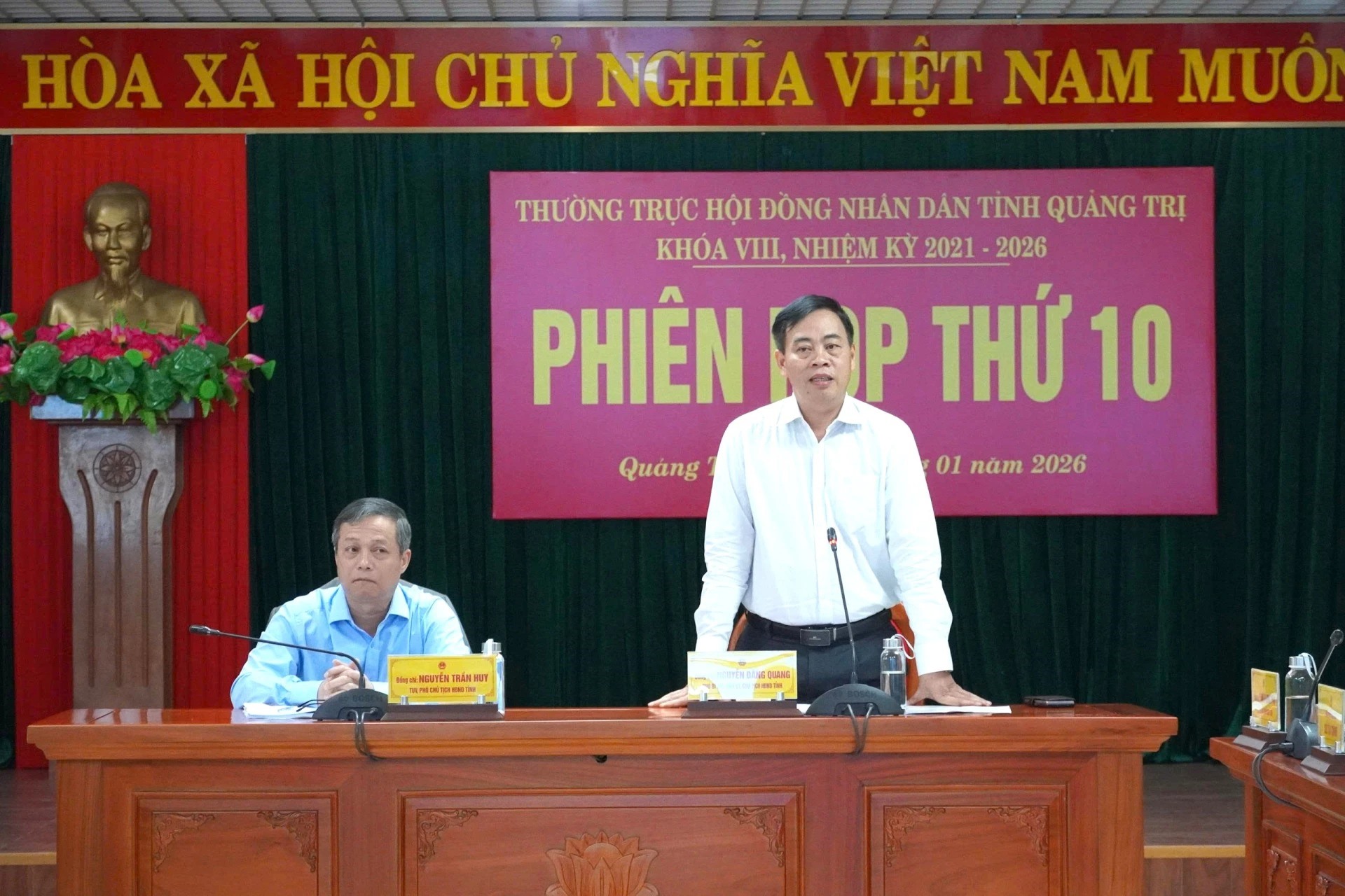 Chiều 30/1, Thường trực HĐND tỉnh tổ chức phiên họp thứ 10 để giải quyết một số công việc thuộc thẩm quyền, rà soát các nội dung chương trình kỳ họp thứ 6 (kỳ họp chuyên đề) HĐND tỉnh khóa VIII. Đồng chí Nguyễn Đăng Quang, Phó Bí thư Tỉnh ủy, Chủ tịch HĐND tỉnh và đồng chí Nguyễn Trần Huy, Phó Chủ tịch HĐND tỉnh chủ trì phiên họp. Tham dự có các đồng chí: Phạm Thị Hân, Ủy viên Ban Thường vụ Tỉnh ủy, Bí thư Đảng ủy Đoàn ĐBQH và HĐND tỉnh; Phan Phong Phú, Phó Chủ tịch UBND tỉnh; đại diện lãnh đạo các sở, ban, ngành liên quan.