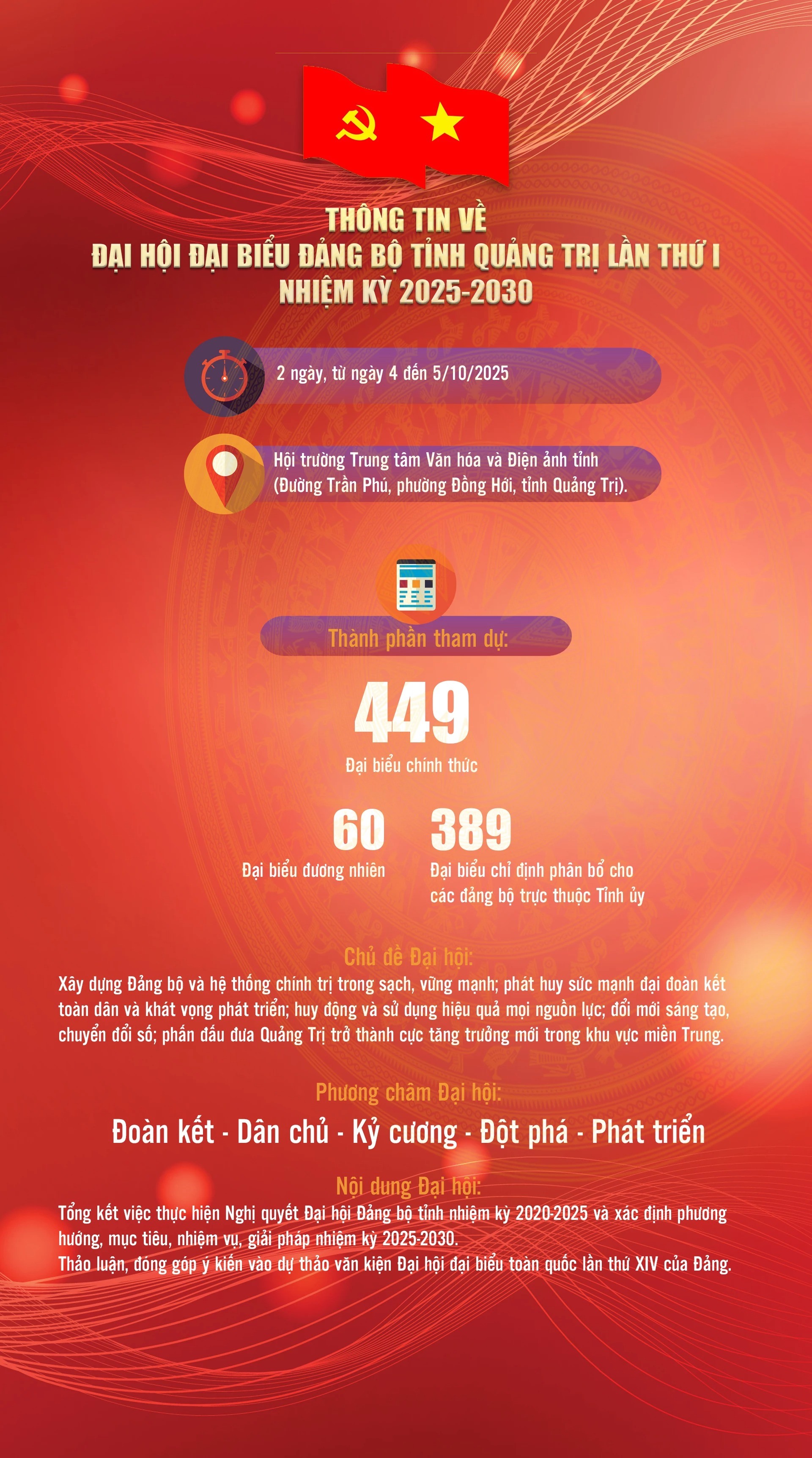 Đại hội đại biểu Đảng bộ tỉnh Quảng Trị lần thứ I, nhiệm kỳ 2025 - 2030 là sự kiện chính trị trọng đại, đánh dấu bước phát triển mới của tỉnh sau sáp nhập. Đại hội là dịp để tiếp tục khẳng định ý chí, niềm tin, khát vọng phát triển, cổ vũ toàn Đảng, toàn dân, toàn quân quyết tâm thực hiện thắng lợi mục tiêu xây dựng tỉnh Quảng Trị trở thành cực tăng trưởng mới trong khu vực miền Trung.