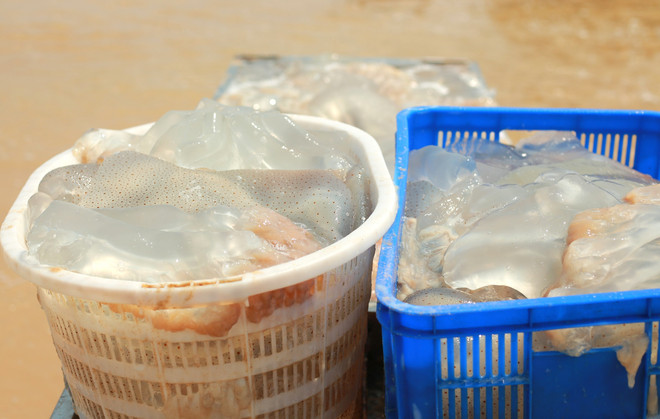 Sứa sau khi được kéo lên sẽ nhanh chóng phân loại, vận chuyển vào bờ. Với sản lượng cao, mỗi chuyến biển có thể thu từ hàng tấn sứa, giúp ngư dân rút ngắn thời gian khai thác nhưng vẫn đạt hiệu quả kinh tế đáng kể.