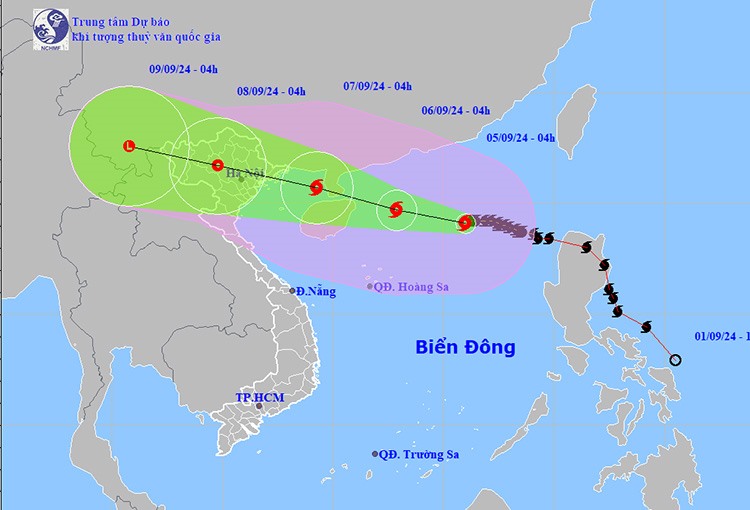Đến nay, bão vẫn giữ cường độ cấp 16, giật trên cấp 17, di chuyển theo hướng Tây, tốc độ 15 - 20km/giờ. Dự báo đến 10 giờ ngày 7/9, bão đi vào Bắc vịnh Bắc Bộ, vị trí bão tại trên vùng biển các tỉnh Quảng Ninh - Nam Định, cường độ bão mạnh cấp 12 - 13, giật cấp 15.