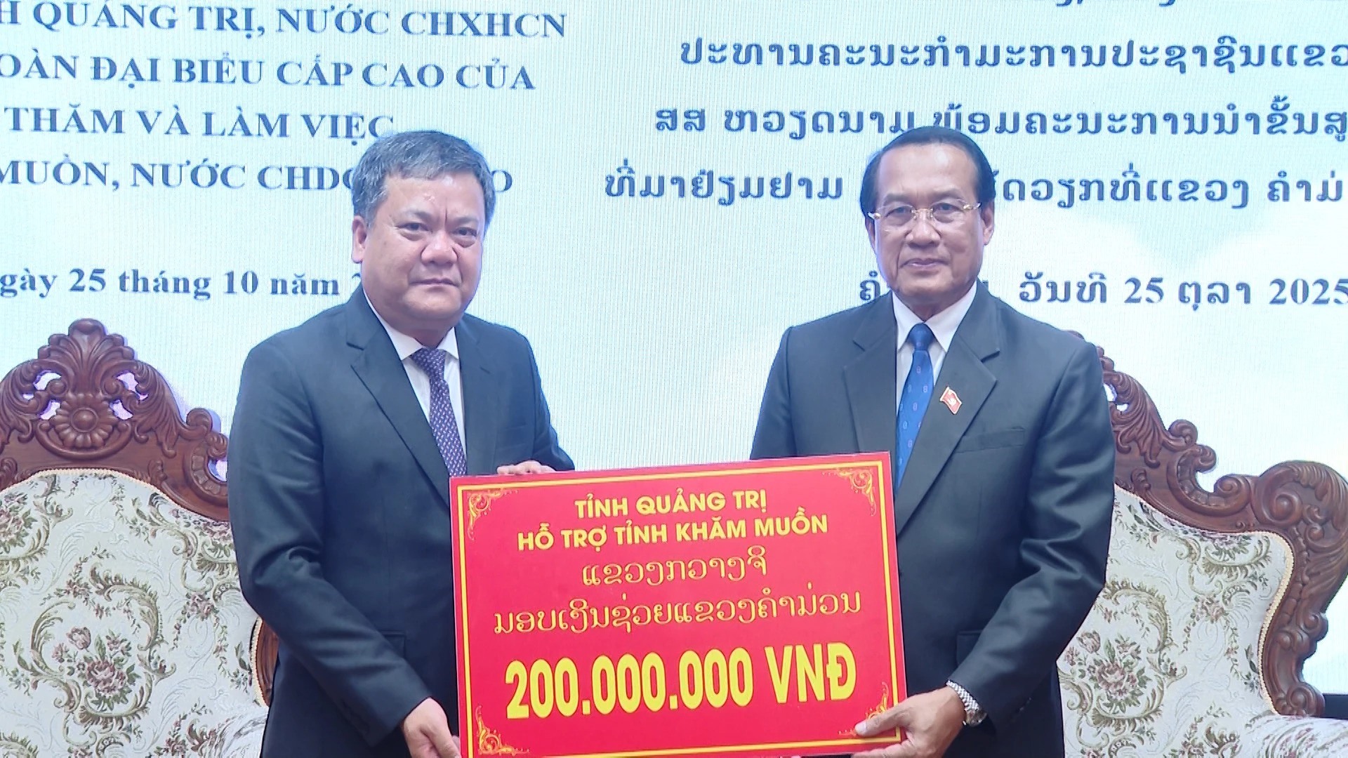 Tại buổi chào xã giao, Đoàn đại biểu cấp cao đã trao tặng 200 triệu đồng của tỉnh Quảng Trị hỗ trợ tỉnh Khammuane thực hiện công tác an sinh xã hội.