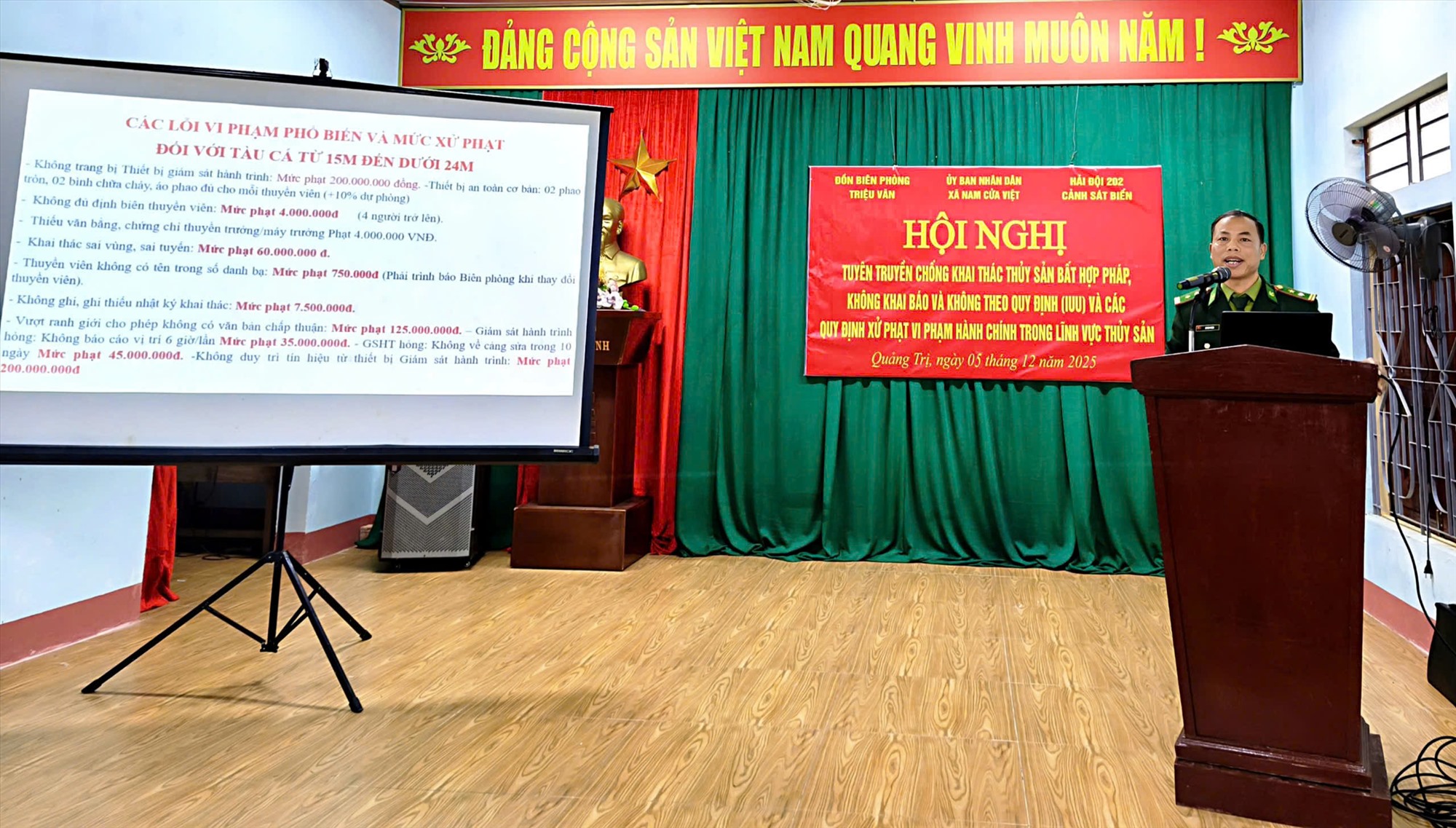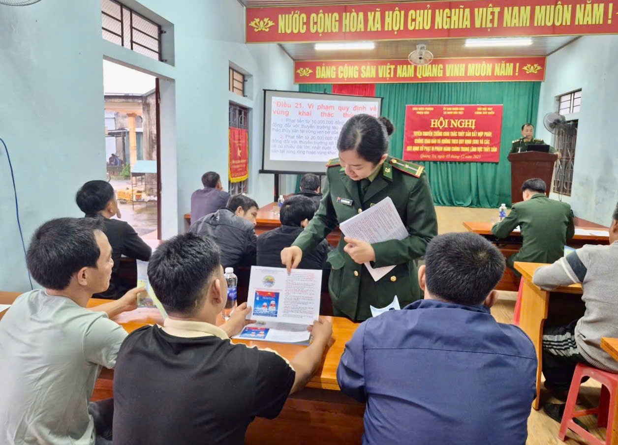 Ngày 05/12/2025, Đồn Biên phòng Triệu Vân (BĐBP Quảng Trị) phối hợp với UBND xã Nam Cửa Việt và Hải đội 202 (Bộ Tư lệnh Vùng Cảnh sát biển 2) tổ chức tuyên truyền các quy định của pháp luật về hoạt động khai thác thủy sản, các quy định về chống khai thác IUU cho hơn 100 ngư dân là chủ thuyền, thuyền trưởng.