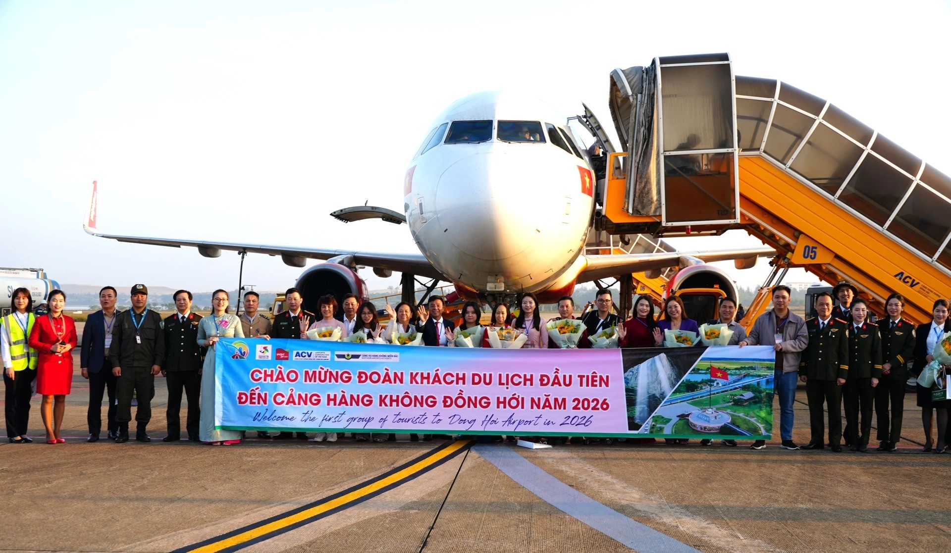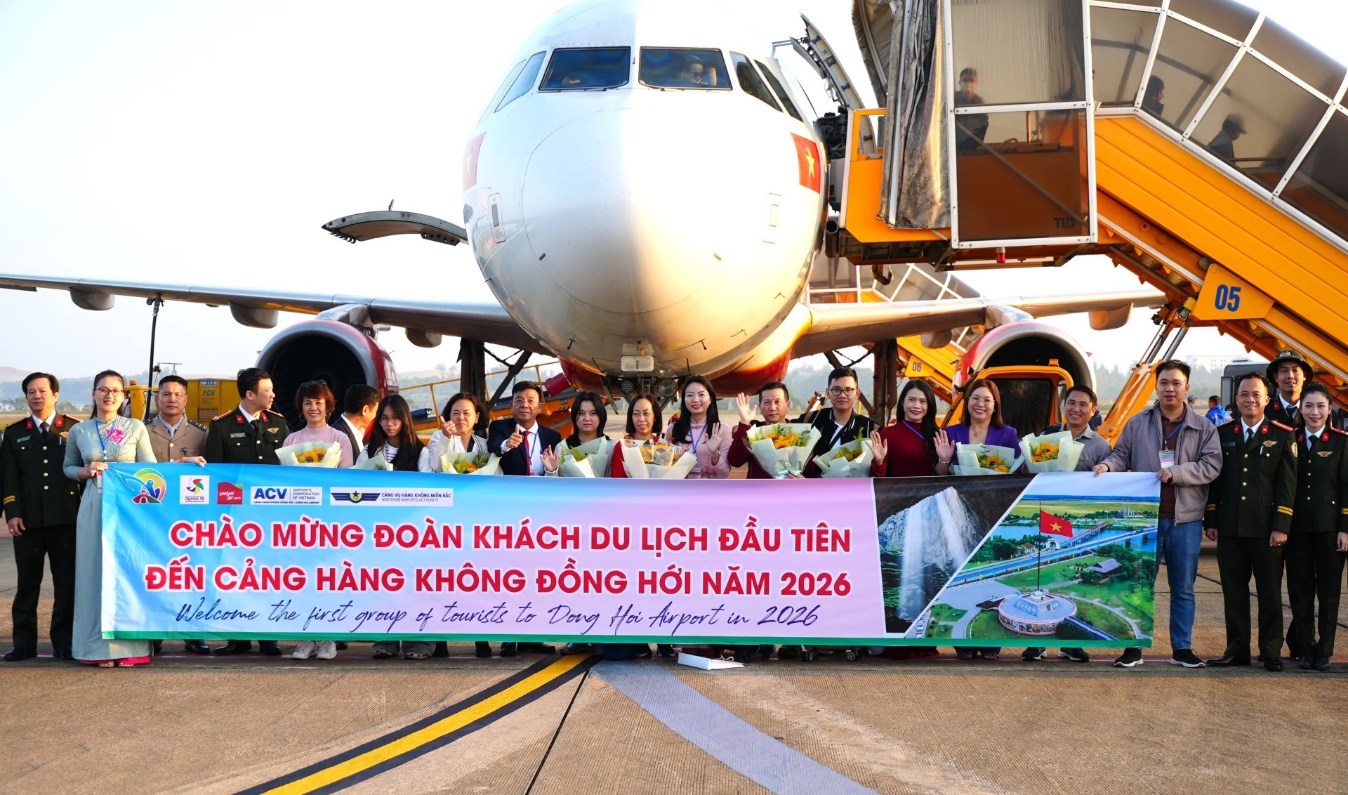 Sáng 1/1, Sở Văn hóa-Thể thao và Du lịch phối hợp với các đơn vị liên quan tổ chức đón đoàn khách du lịch đầu tiên đến Quảng Trị bằng đường hàng không tại Cảng hàng không Đồng Hới, mở đầu cho các hoạt động du lịch trong năm mới 2026.