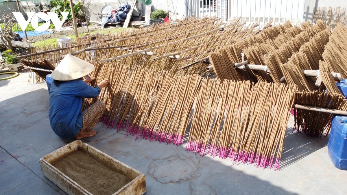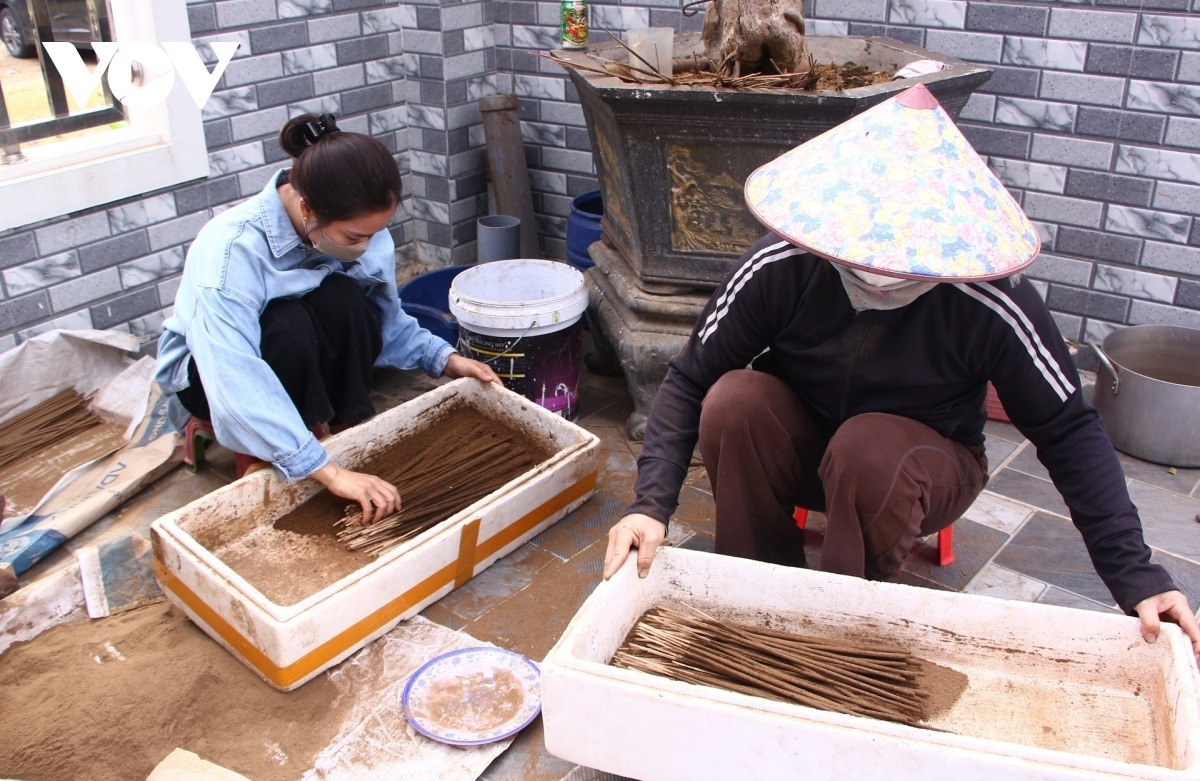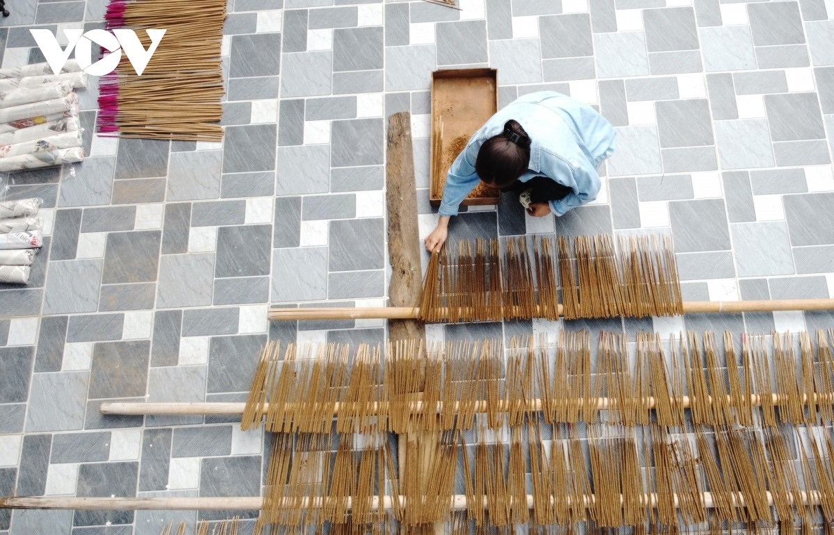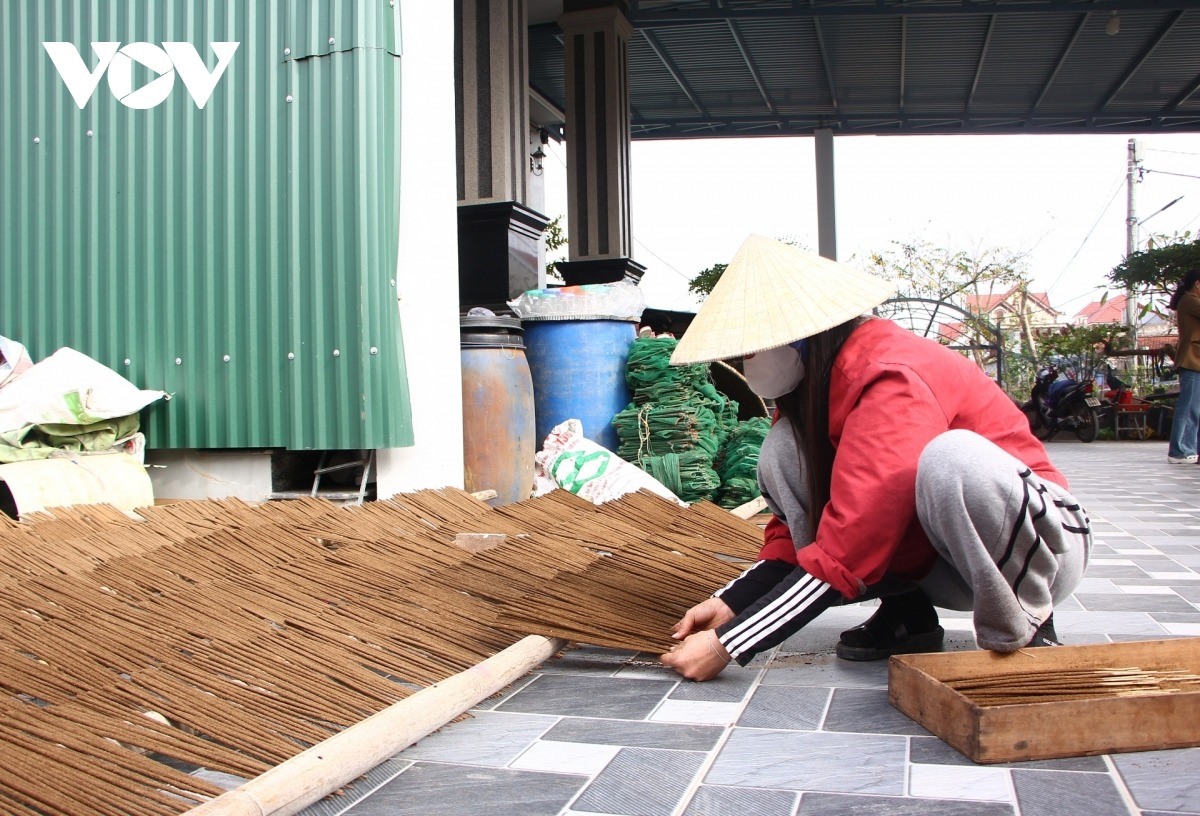 Thời tiết nắng nhẹ, thích hợp để làm hương. Tại từng sân nhà, khoảng vườn, người dân đem hương trầm vừa mới làm thủ công ra phơi nắng. Bà Nguyễn Thị Phương, 55 tuổi, ở thôn Quyết Thắng, xã Bắc Trạch, tỉnh Quảng Trị tiếp nối nghề làm hương của thế hệ trước trao truyền. Ở làng nghề này, hầu như gia đình nào cũng làm hương bán dịp Tết. Quanh năm, bà con làm nhiều công việc thời vụ khác như nông nghiệp, ngư nghiệp, bán hàng, lái xe... Cận tết, mọi người tranh thủ thời gian nhàn rỗi ở nhà làm hương, kiếm tiền mua sắm Tết và cũng là cách để giữ lửa làng nghề.