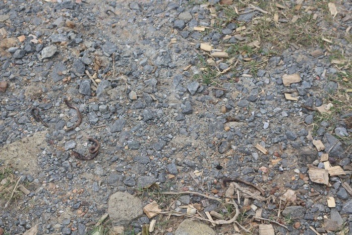 Giữa trời nắng, nhiều con giun khô quắt lại, co rút trên đường, trong khi số khác ngọ nguậy yếu ớt. Vệt giun nằm rải rác kéo dài hàng chục mét, dày đặc hơn ở những khoảng trống thông thoáng.