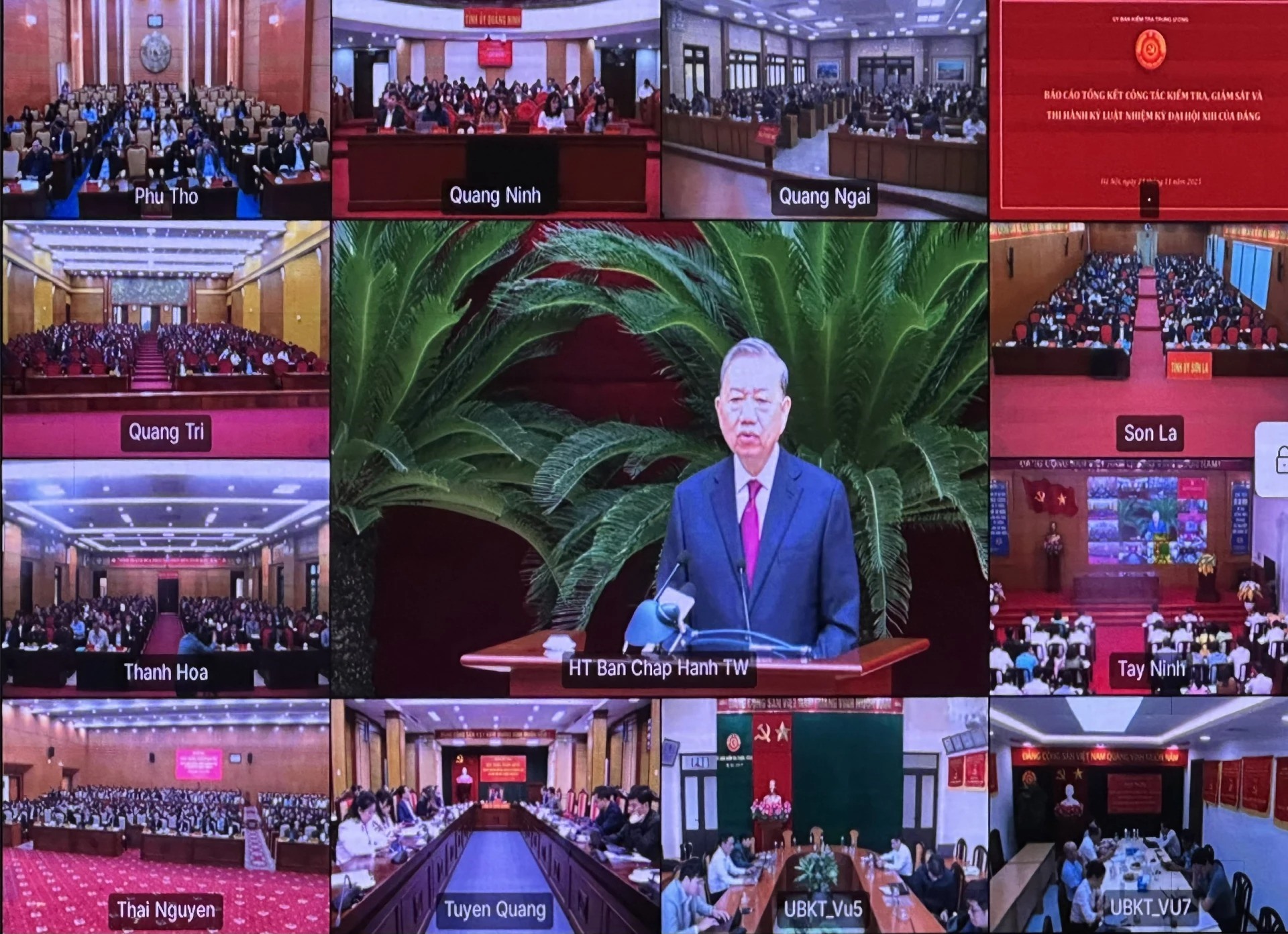 Các đồng chí: Tô Lâm, Tổng Bí thư; Trần Cẩm Tú, Ủy viên Bộ Chính trị, Thường trực Ban Bí thư; Trần Sỹ Thanh, Chủ nhiệm Ủy ban Kiểm tra (UBKT) Trung ương chủ trì hội nghị. Tham dự hội nghị tại điểm cầu Trung ương có đồng chí Lương Cường, Ủy viên Bộ Chính trị, Chủ tịch nước; các đồng chí Ủy viên Bộ Chính trị; Ủy viên Ban chấp hành Trung ương; lãnh đạo các ban, bộ, ngành Trung ương, các Tỉnh ủy, Thành ủy, UBKT trực thuộc Trung ương.