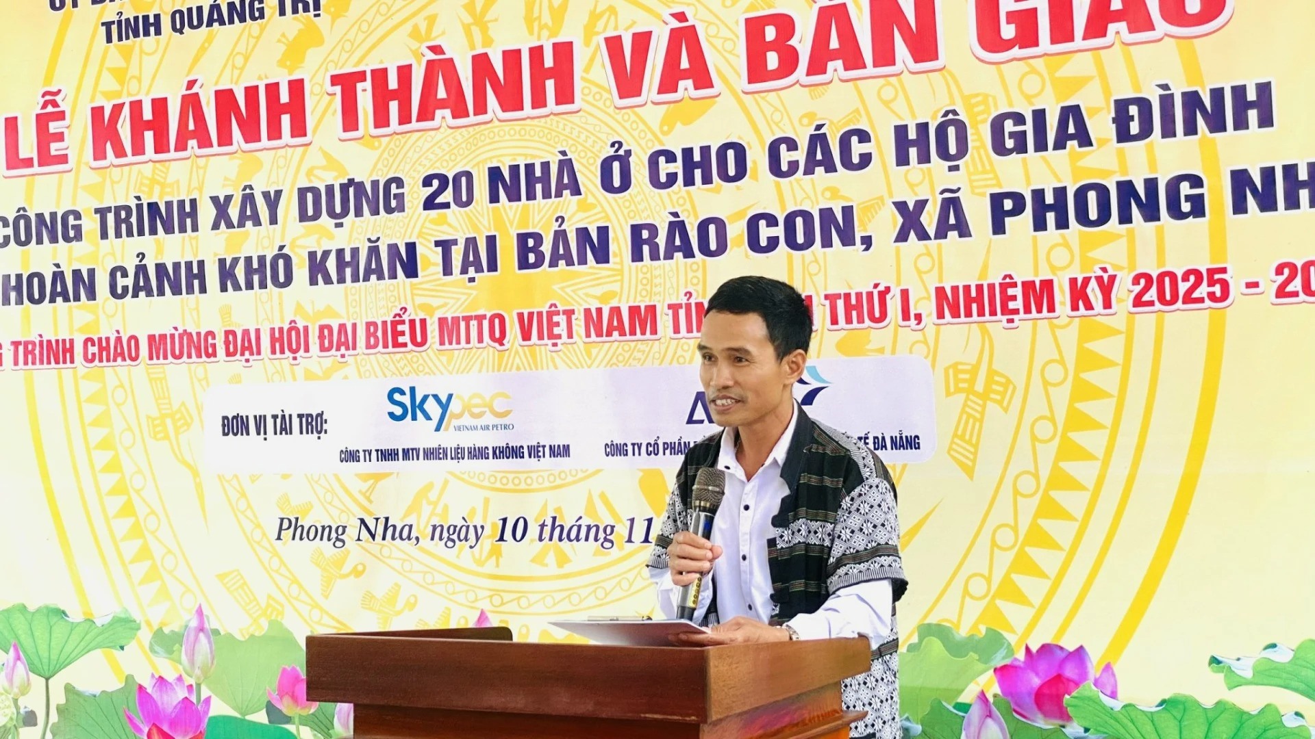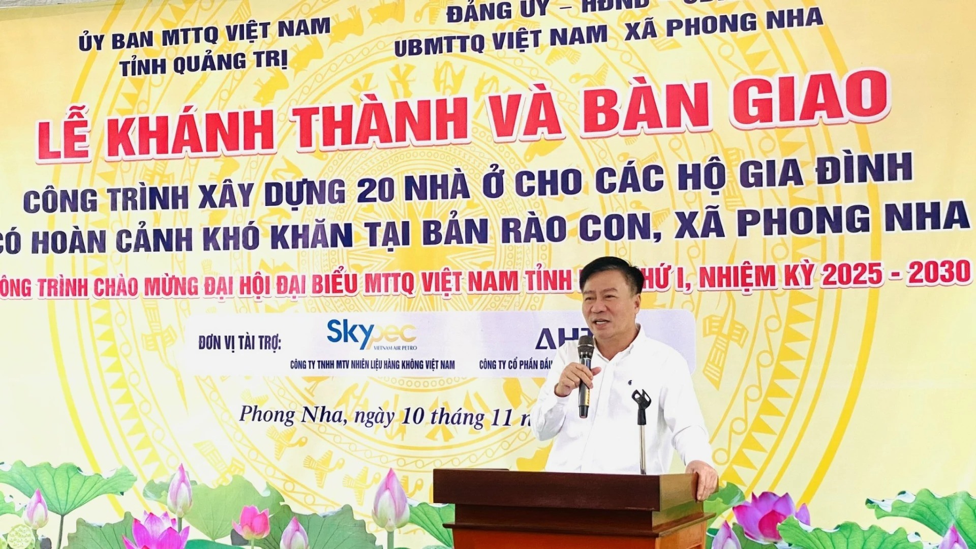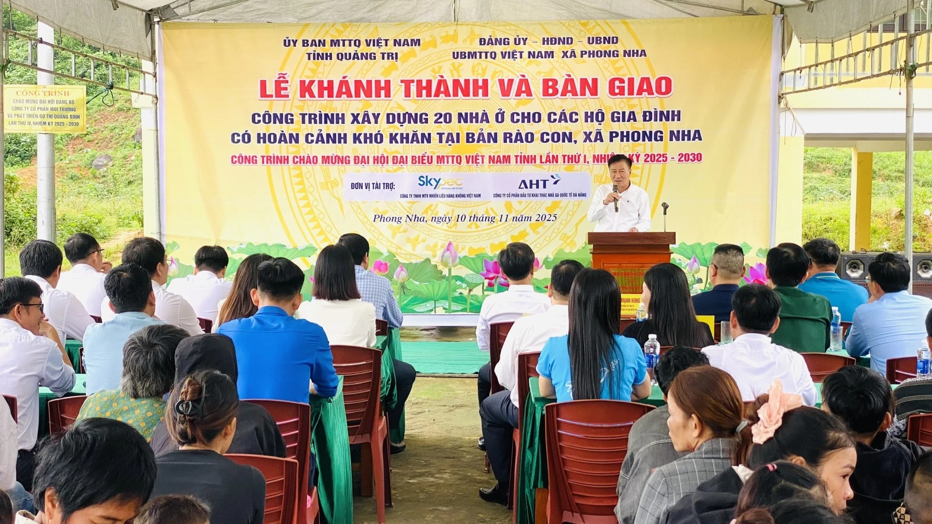 Sáng 10/11, Ban Thường trực Ủy ban MTTQ Việt Nam tỉnh phối hợp với Đảng ủy, chính quyền, Mặt trận TQVN xã Phong Nha và các nhà tài trợ tổ chức lễ khánh thành, bàn giao 20 nhà ở cho các gia đình hoàn cảnh khó khăn tại bản Rào Con, xã Phong Nha. Dự lễ có các đồng chí: Nguyễn Chiến Thắng, Phó Bí thư Tỉnh ủy, Chủ tịch Ủy ban MTTQ Việt Nam tỉnh; Đào Mạnh Hùng, Ủy viên Ban Thường vụ Tỉnh ủy, Phó Chủ tịch Thường trực Ủy ban MTTQ Việt Nam tỉnh; lãnh đạo các sở, ngành, đơn vị liên quan và các nhà tài trợ.