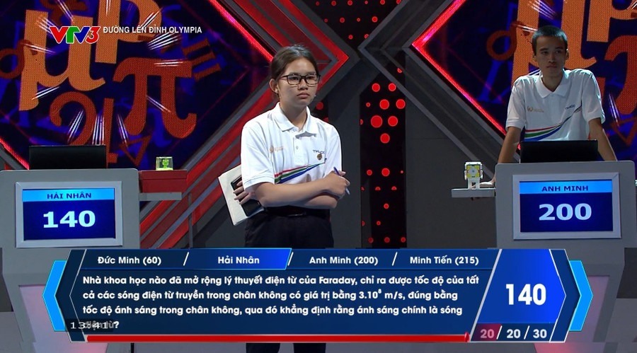 Minh Tiến chọn gói câu hỏi 20-20-20 điểm. Trả lời đúng ở cả ba câu, Tiến hoàn thành phần thi với 215 điểm, vươn lên vị trí dẫn đầu.