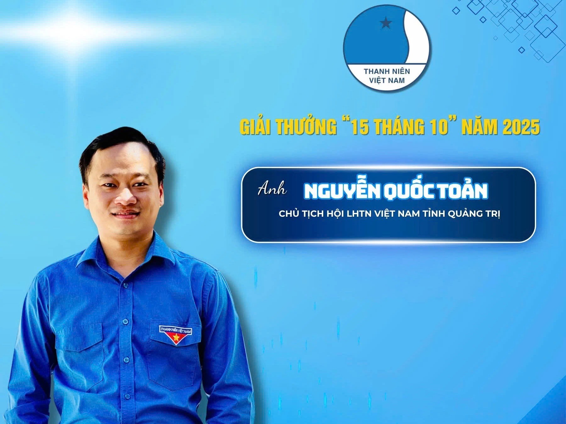 Hội LHTN Việt Nam tỉnh Quảng Trị vinh dự có 2 cán bộ, thanh niên được Ủy ban Trung ương Hội LHTN Việt Nam trao Giải thưởng “15 tháng 10”, gồm: Nguyễn Quốc Toản, Phó Bí thư Tỉnh đoàn, Chủ tịch Hội LHTN Việt Nam tỉnh; Phan Trần Tuấn Anh, Phó Chủ tịch Thường trực Hội LHTN Việt Nam tỉnh.