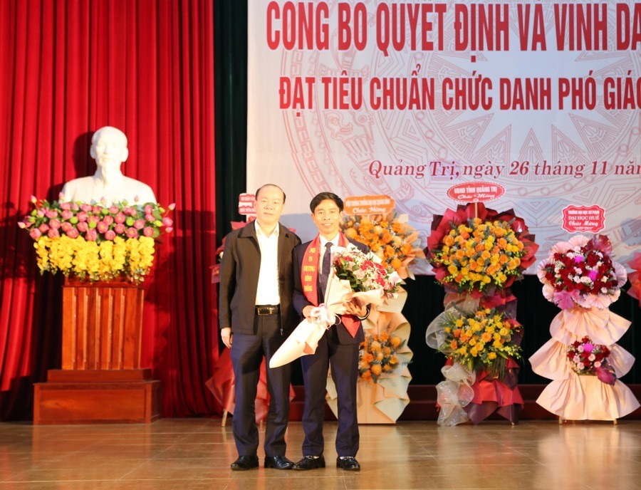 Tại buổi lễ, lãnh đạo Trường Cao đẳng Sư phạm Quảng Trị công bố quyết định và vinh danh nhà giáo đạt chuẩn chức danh Phó Giáo sư năm 2025 đối với TS. Trương Đình Thăng – Hiệu trưởng nhà trường.