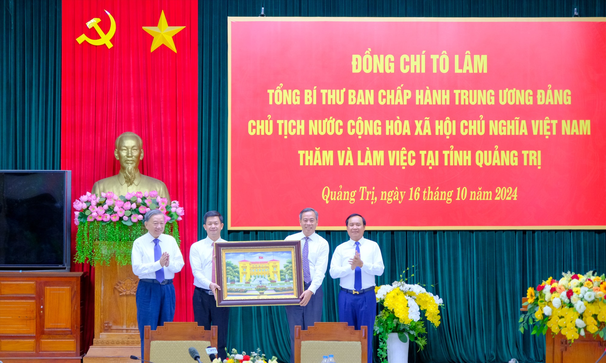 4 nhà giáo, nhà khoa học tiêu biểu của Đại học Quốc gia Hà Nội gồm GS-TSKH Nguyễn Đình Đức (Trường Đại học Công nghệ), PGS-TS Nguyễn Quang Huy và PGS-TS Trần Mạnh Trí (Trường Đại học Khoa học Tự nhiên), GS-TS Đặng Hoàng Minh (Trường Đại học Giáo dục) đại diện cho các nhà giáo vinh dự nhận bó hoa tươi thắm từ Tổng Bí thư Tô Lâm dành cho ngành giáo dục.
