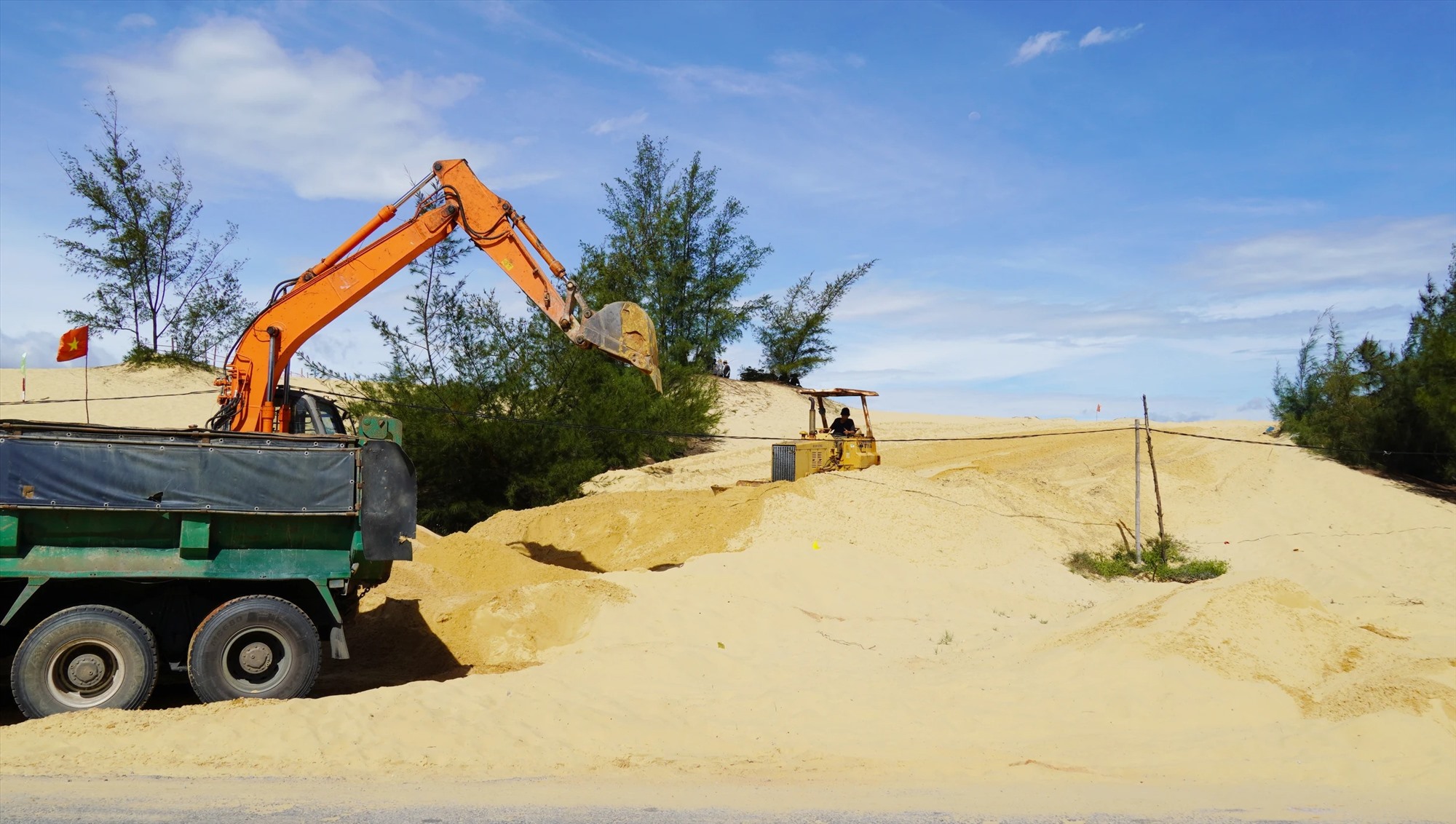 Để tìm hiểu sự việc, sáng 16/7, chúng tôi có mặt tại đồi cát Nam Trạch. Tại đây, ngay giữa đồi cát trắng, một hàng rào tre có giăng dây kéo dài, cắt ngang đường lên đồi cát. Trong phạm vi hàng rào, nhiều phương tiện máy móc công trình như máy ủi, xe xúc, ô tô tải đang thi công san ủi mặt bằng tạo đường lên đồi. Do đó, nhiều xe mô tô địa hình ATV đưa du khách lên đồi cát bị cản trở.