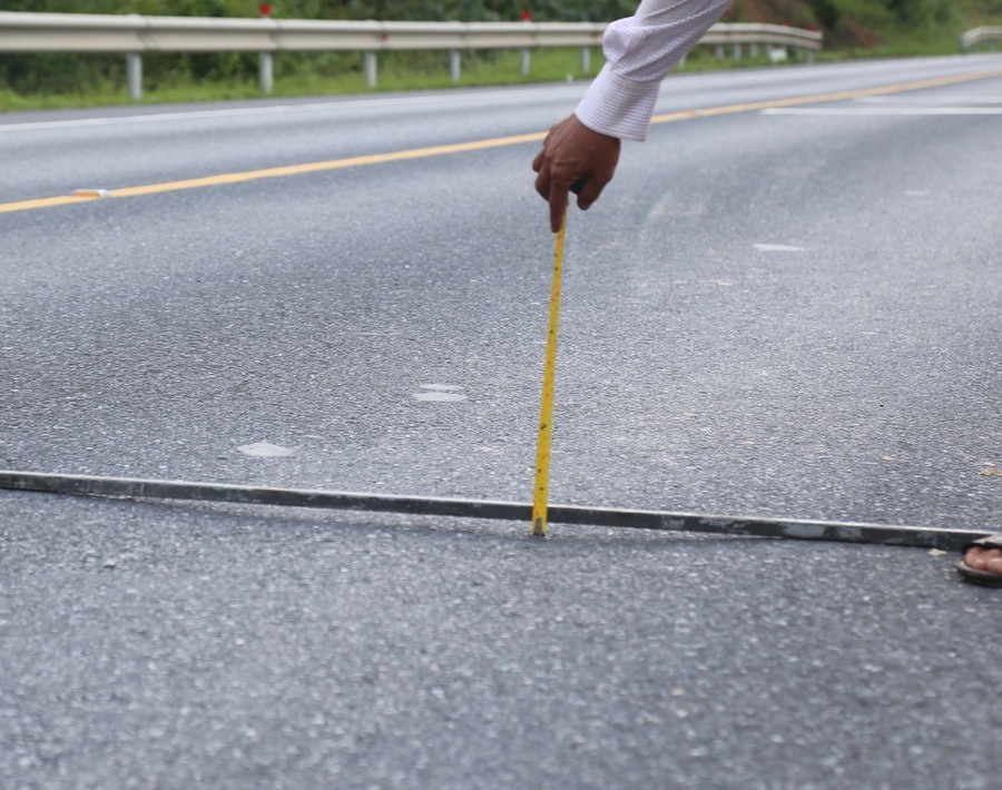Đặc biệt, một số vị trí tại km2+900, km4+800, km12+550… mặt đường bị hằn lõm, trơn láng. Có điểm bị hằn sâu gần 2cm.