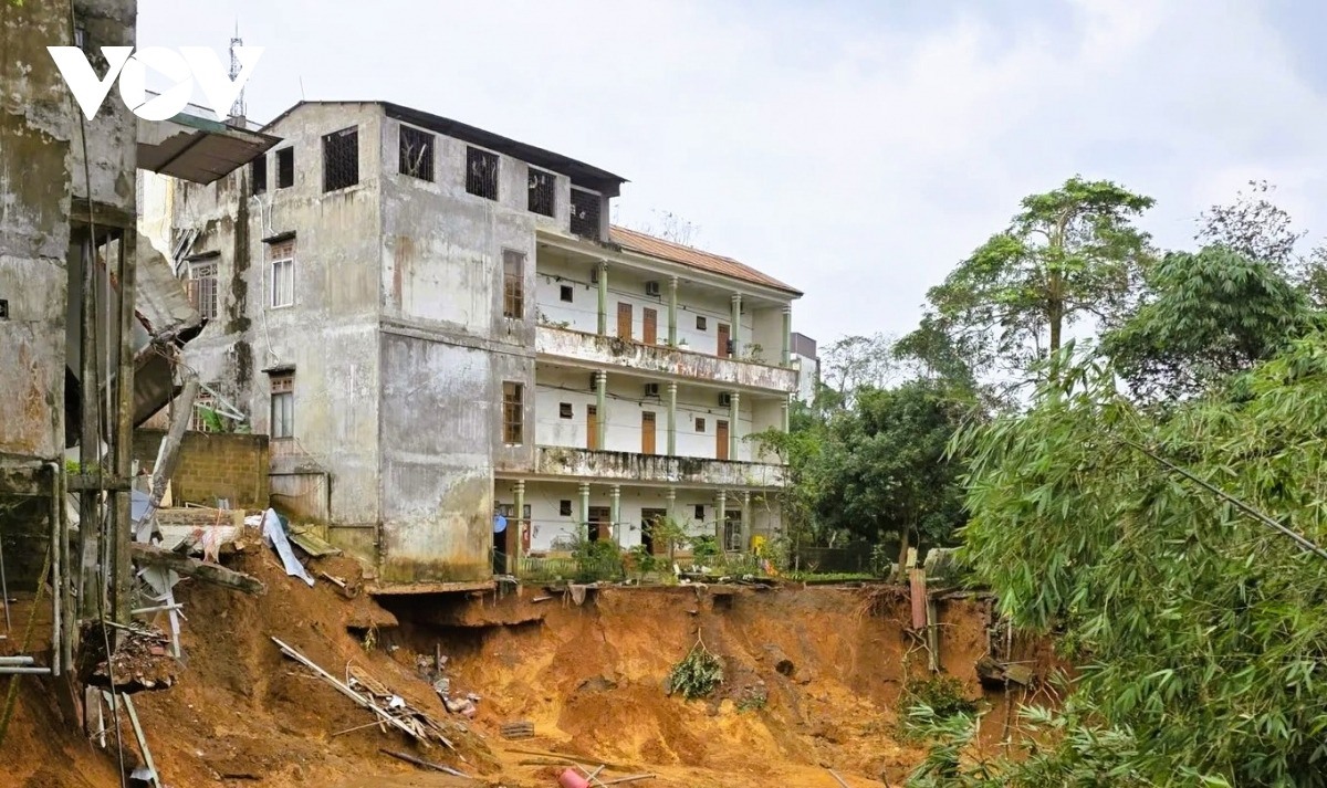 Dọc đường Hùng Vương, xã Khe Sanh, nhiều nhà dân có dấu hiệu sụt lún, nặng nhất là khách sạn 4 tầng của bà Hoàng Diệu Linh. Toàn bộ phần móng sau bị rút hàm ếch, có thể đổ sập bất cứ lúc nào. Bà Hoàng Diệu Linh cho biết: “Mưa xối xả, nghe tiếng động, tôi nhìn ra thấy nhà bên kia bị sụp xuống, cả tường nhà, hành lang rơi xuống. Đất lở dần vô sát móng nhà tôi. Lúc đó cả nhà chạy đi luôn, không kịp cầm đồ đạc gì, chạy ra trước cho an toàn. Sau đó thì có công an, bộ đội vô giúp đỡ.”