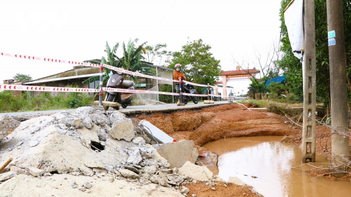 Từng mảng bê tông bị nước lũ cuốn phăng, khoét sâu hàm ếch vào ta luy đường. Theo ông Nguyễn Trạch, người dân thôn Trà Liên Tây, xã Ái Tử, tỉnh Quảng Trị thì chính quyền địa phương đã tạm giăng dây bảo đảm an toàn người và phương tiện qua lại khu vực này. “Trước đây khu vực này đã bị sạt lở rồi… Công trình chưa nghiệm thu nay bị sạt lở lại. Rất mong cấp trên quan tâm khắc phục để bà con yên tâm.”