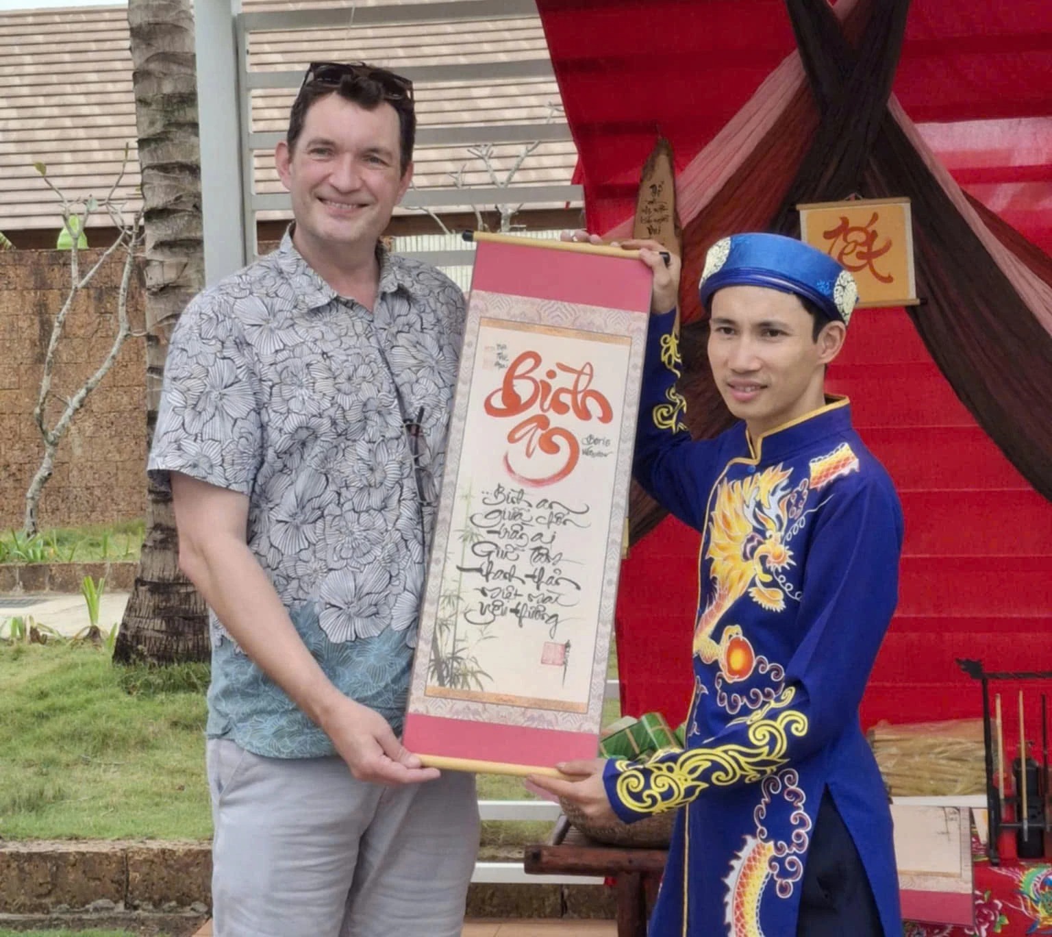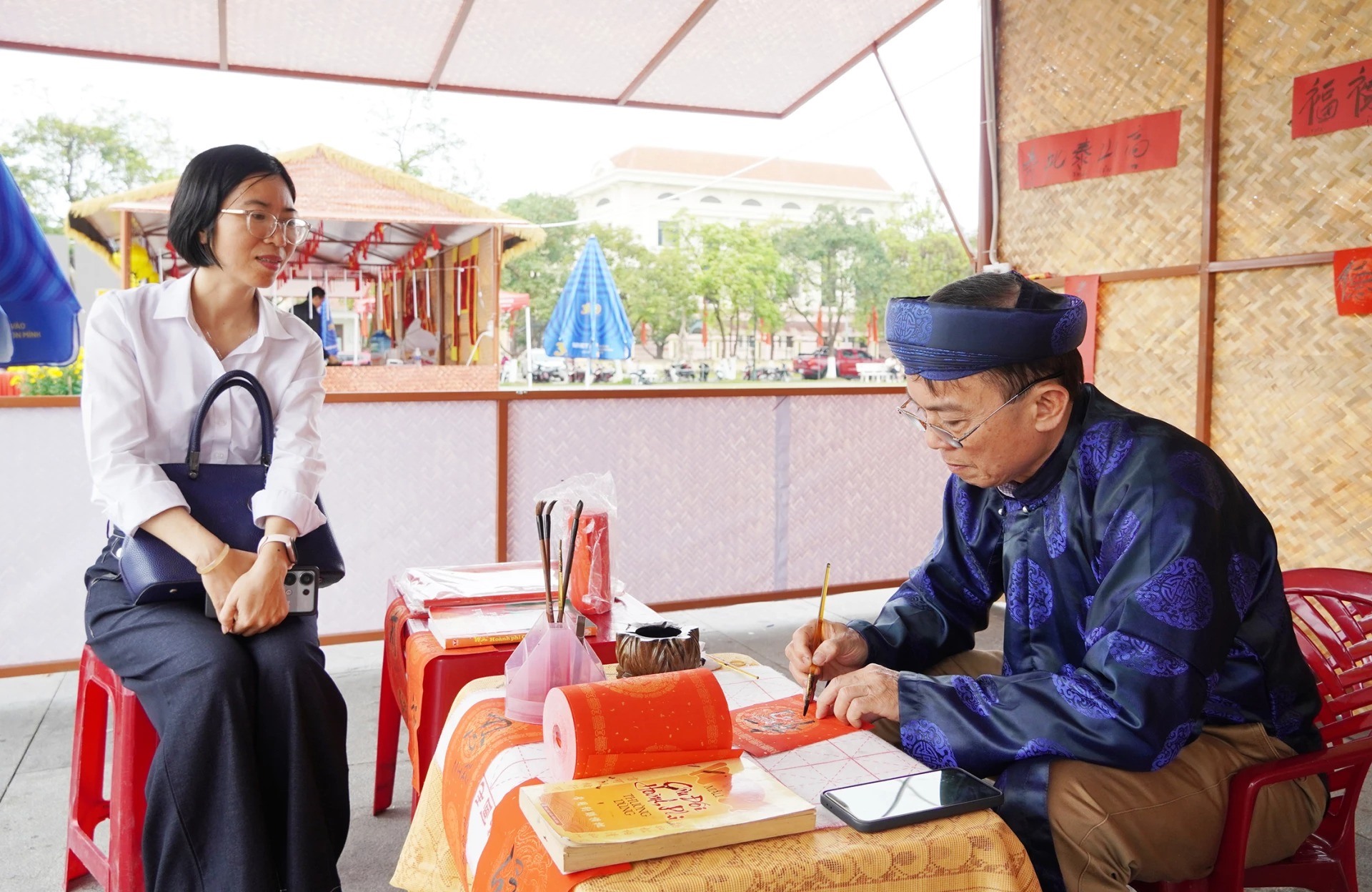Bởi thế, thành thông lệ, cứ mỗi dịp Tết đến, xuân về, người dân tỉnh Quảng Trị đã quen thuộc với hình ảnh những thầy đồ ngày ngày cho chữ ở quảng trường Hồ Chí Minh, đình chùa… Thầy đồ mang áo dài, khăn đóng say sưa mài nghiên, múa bút, những nét thư pháp uyển chuyển, tinh tế không chỉ thể hiện đôi tay tài hoa mà còn mang theo ước nguyện thành tâm về một năm mới bình an, hạnh phúc cho người xin chữ. Tất cả tạo nên một không gian vừa linh thiêng, vừa đời thường, nơi ai cũng có thể dừng lại vài phút để nghĩ về điều mình mong cầu trong năm mới.