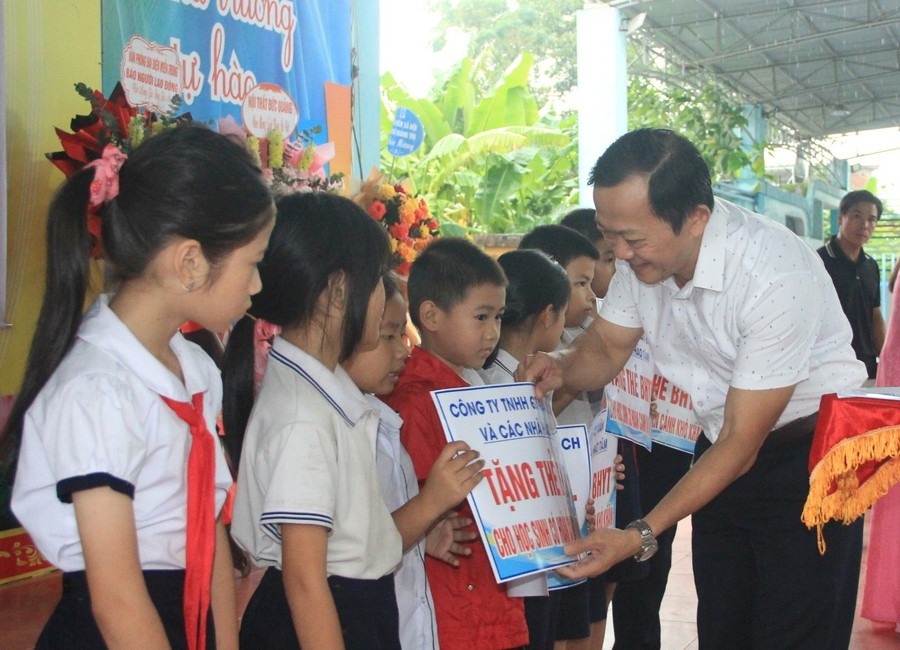 Hàng chục thẻ bảo hiểm y tế và quà tặng được trao đến học sinh khó khăn và các đơn vị trường học ở phường Quảng Trị.
