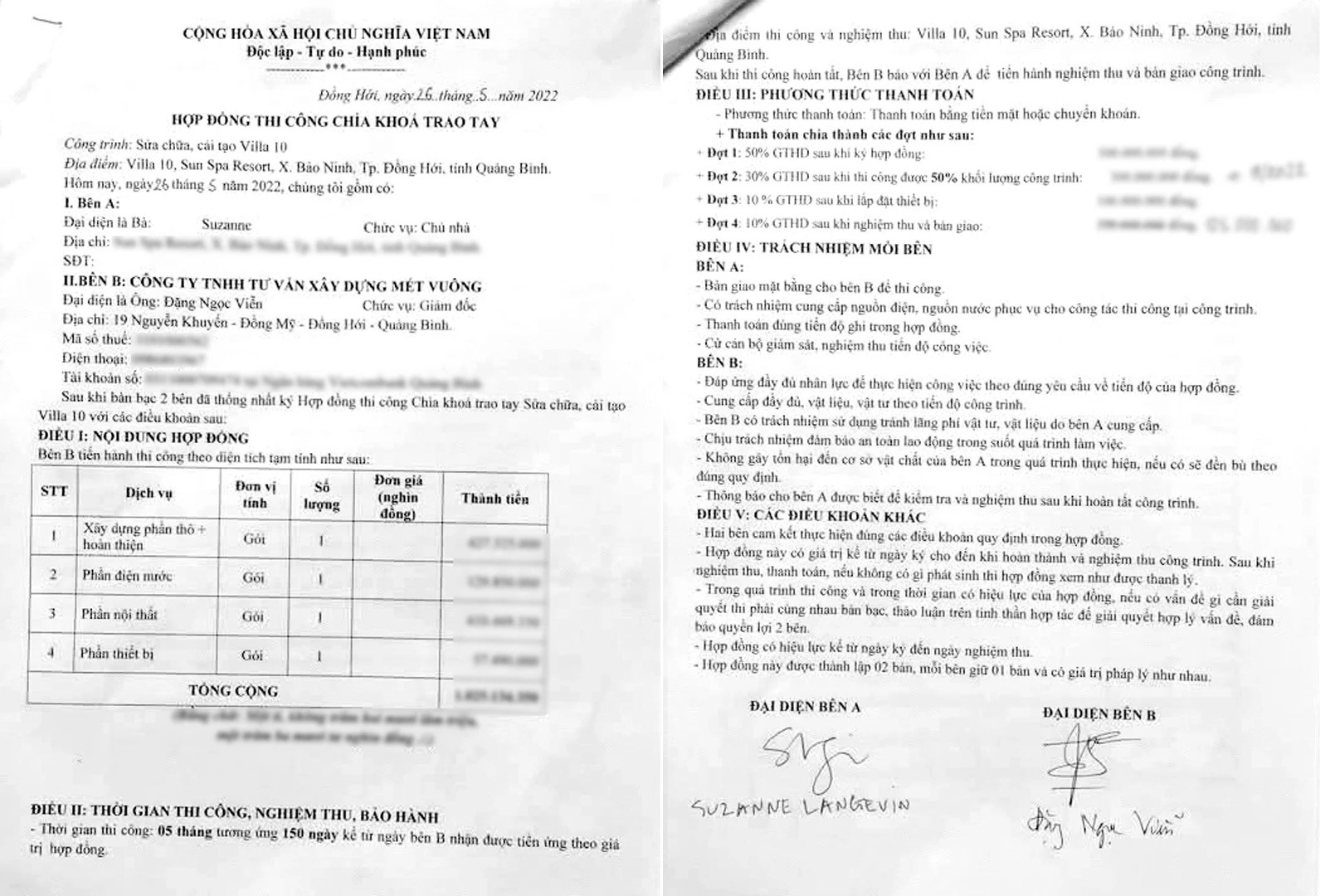 Trình bày với chúng tôi, bà Langevin Suzanne bức xúc cho rằng, bà biết đến Công ty TNHH Tư vấn Xây dựng Mét Vuông (gọi tắt là Công ty Mét Vuông) qua người giới thiệu. Là một người nước ngoài mới đến sinh sống tại Quảng Bình cũ (nay là tỉnh Quảng Trị), chưa am hiểu pháp luật của Việt Nam, nên trước đó, bà đã cẩn thận tìm hiểu thông tin của công ty trên các phương tiện. Quá trình làm việc với ông Đặng Ngọc Viễn, Giám đốc Công ty Mét Vuông (chủ yếu thông qua người phiên dịch-PV), bà chỉ chú ý đến các chi tiết thiết kế và hạng mục thi công làm sao cho đúng với ý tưởng của mình.
