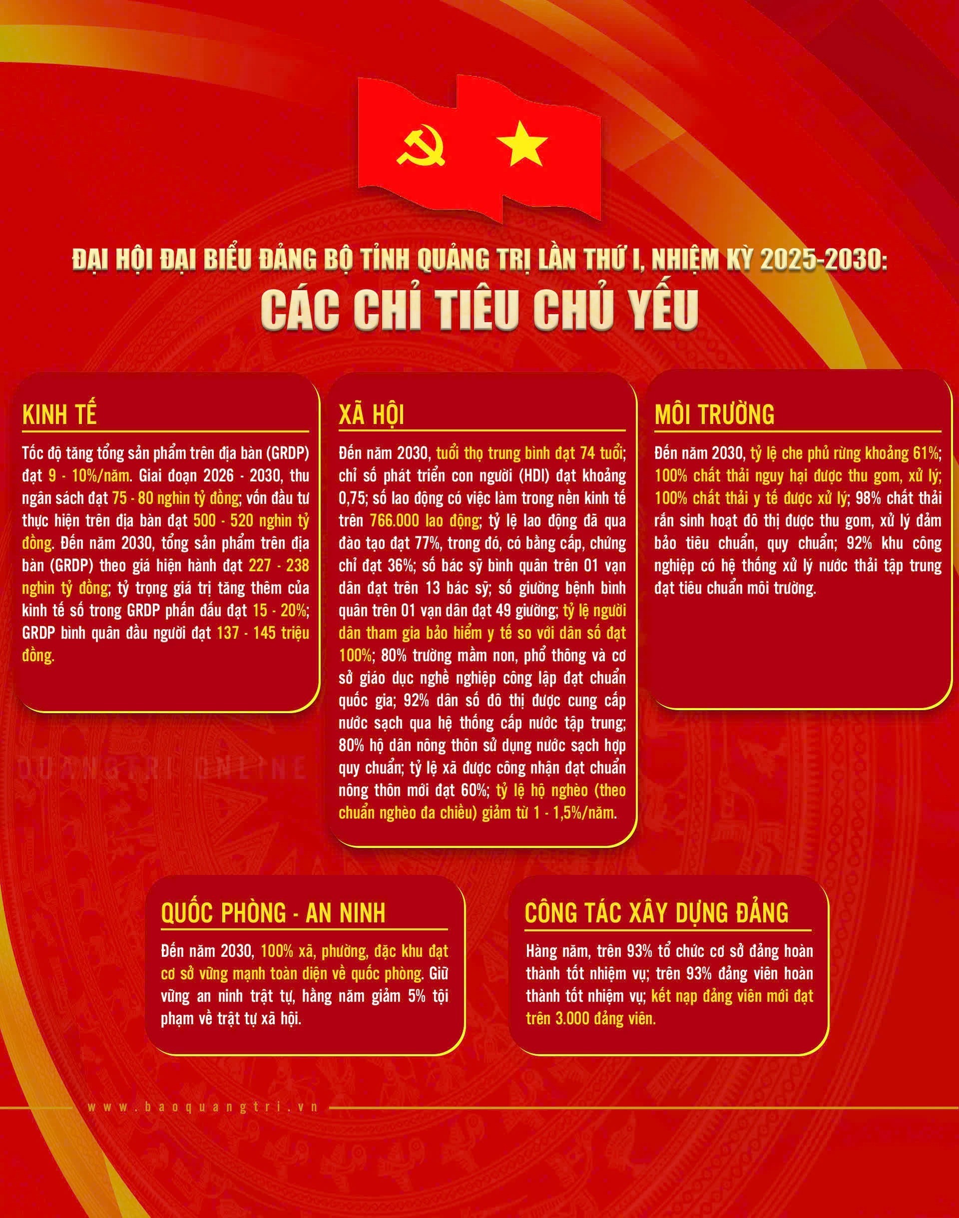 Đại hội đại biểu Đảng bộ tỉnh Quảng Trị lần thứ I, nhiệm kỳ 2025-2030 xác định phương hướng, mục tiêu tổng quát là xây dựng Đảng bộ và hệ thống chính trị trong sạch, vững mạnh toàn diện; nâng cao năng lực lãnh đạo và sức chiến đấu của Đảng bộ… Phấn đấu đến năm 2045, Quảng Trị trở thành tỉnh phát triển khá, là trung tâm năng lượng, logistics và du lịch đặc sắc của cả nước.