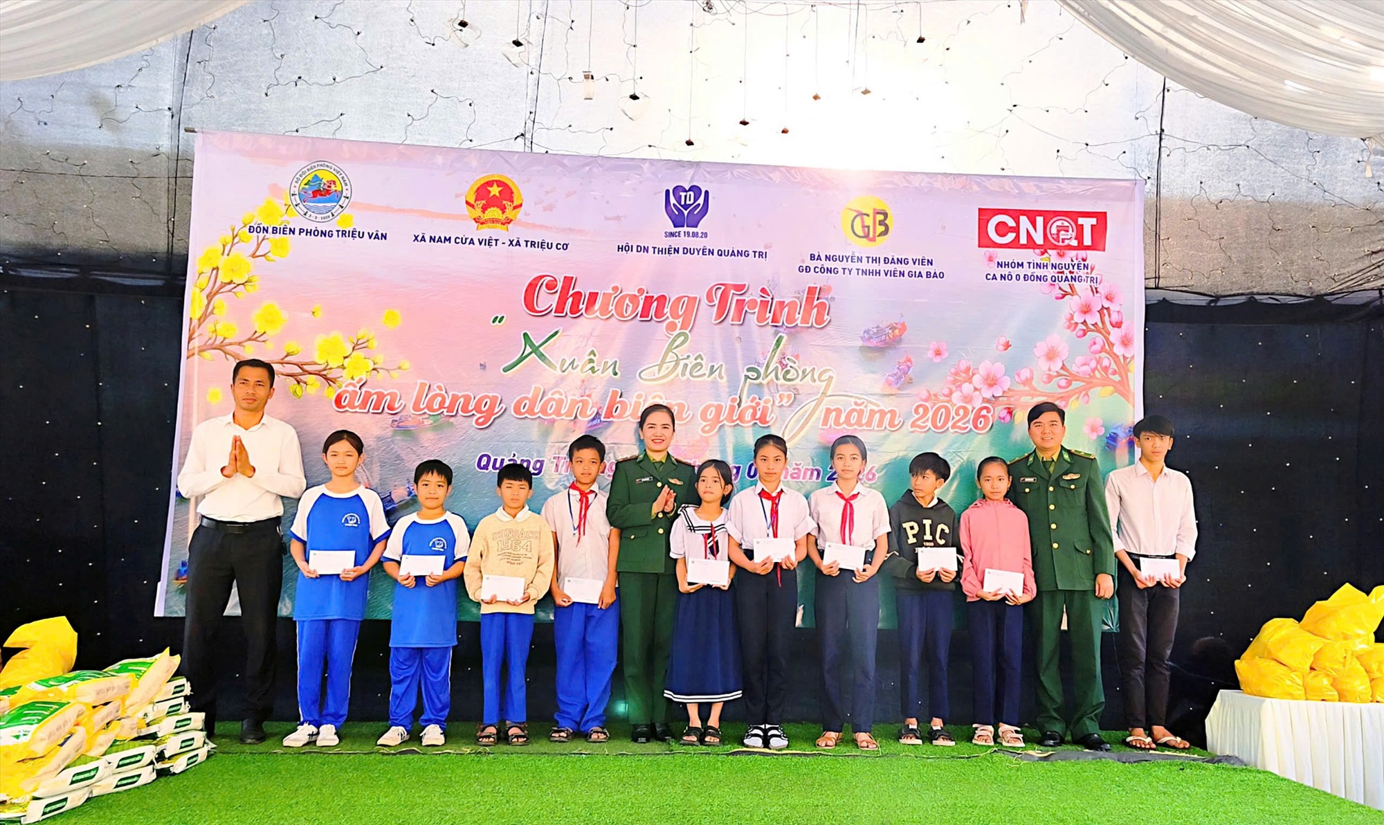 Cùng ngày, Đồn Biên phòng Triệu Vân (BĐBP tỉnh Quảng Trị) phối hợp với cấp ủy, chính quyền hai xã Nam Cửa Việt và Triệu Cơ cùng các doanh nghiệp, nhà hảo tâm tổ chức Chương trình “Xuân Biên phòng – Ấm lòng dân biên giới”.
