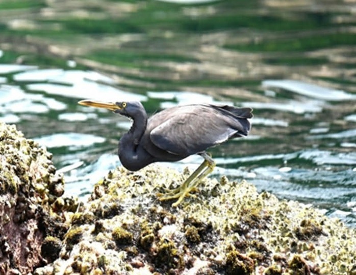Loài Egretta sacra (cò đen/cò rạn) được ghi nhận tại khu vực Vũng Chùa - Đảo Yến, trong tổ hợp sinh cảnh bãi đá ven bờ và vùng triều thấp.