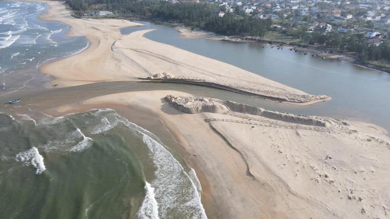 Theo ngư dân địa phương, cát biển bắt đầu bồi lấp mạnh cửa sông Dinh từ cuối năm 2025. Mỗi khi biển động, sóng lớn dồn cát lấp kín cửa sông. Hiện cửa sông hình thành cồn cát dài gần một km, rộng hơn 50 m, chỉ còn một lạch ở phía bắc người dân có thể lội qua, chỗ sâu nhất khoảng 50 cm.
